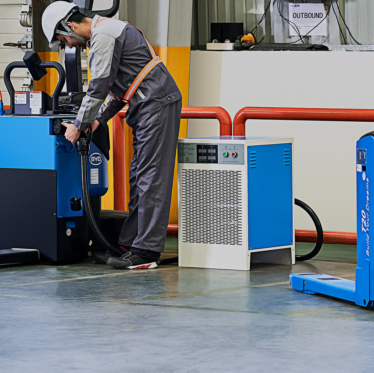 Our technology allows the battery to charge so fast that you will only need a few minutes during breaks to top it up. Just place the forklift next to a BYD charger, plug it in and let it charge until you need to resume operations.